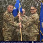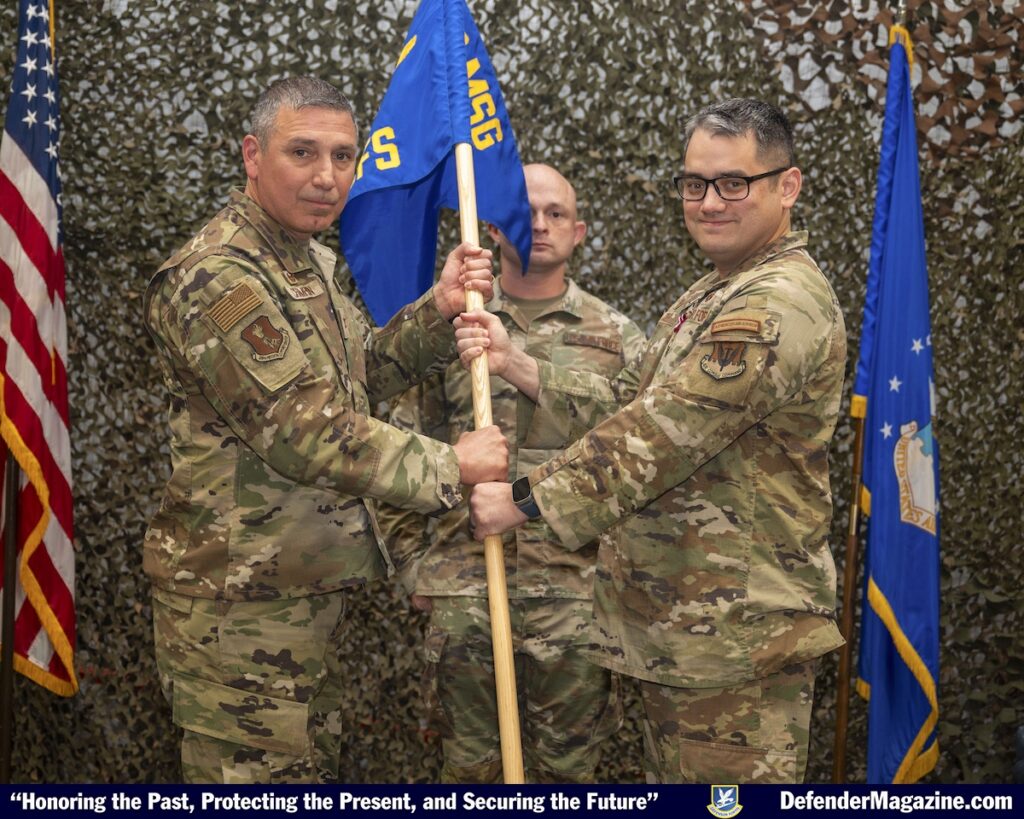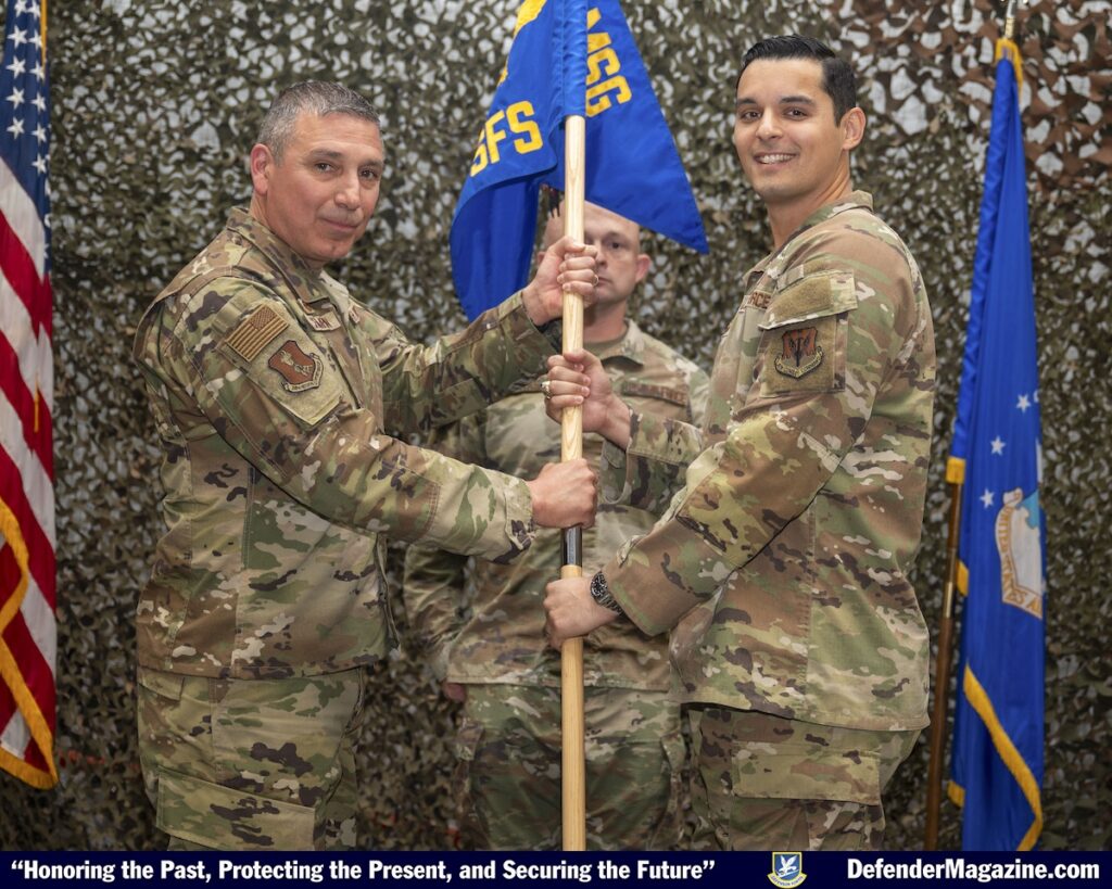 Grand Forks Air Force Base, N.D. — From left, Col. Reynaldo Champion, 319th Mission Support Group commander and Maj. Blaize Dunn, 319th Security Forces Squadron incoming commander, hold the 319th SFS guidon during a change of command ceremony at Grand Forks Air Force Base, North Dakota, June 26, 2025. The passing of the guidon from presiding officer to incoming commander signifies the assumption of command. (U.S. Air Force photo by Senior Airman Anthony Nunez-Pellicer)