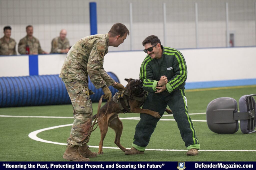 Senior Airman Ryan Faulk, 5th Security Forces Squadron military working dog handler assigned to Minot Air Force Base, N.D., removes MP, 5th SFS military working dog, as he bites Staff Sgt. Stephen Zimmerman, 319th Security Forces Squadron MWD trainer, during a dog agility course at Grand Forks Air Force Base, N.D., May 13, 2025. The final stage of the dog agility course was a bite, tasking the dog with biting an unmoving target, which differs from their training against aggressive moving targets. (U.S. Air Force photo by Airman 1st Class Emma Funderburk)