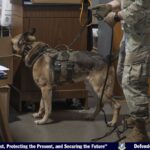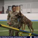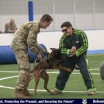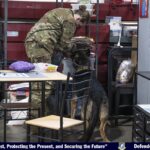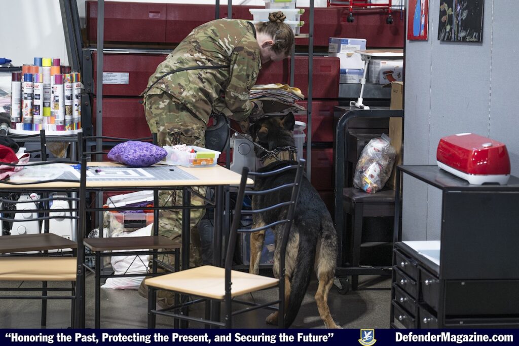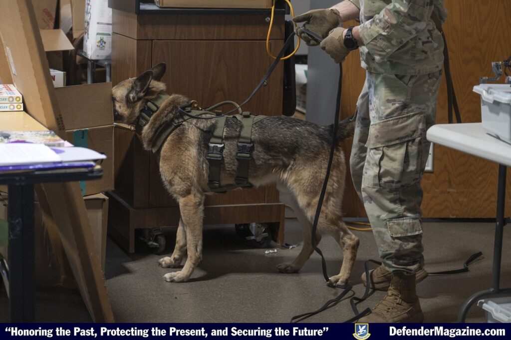 A military working dog team from Minot Air Force Base, N.D., conducts a detection exercise as part of the inaugural Police Week Top Dog of the Tundra Competition at Grand Forks Air Force Base, N.D., May 13, 2025. During the challenge, the MWDs were tasked with detecting and alerting their handler within a certain time limit. (U.S. Air Force photo by Airman 1st Class Emma Funderburk)