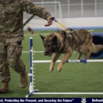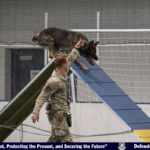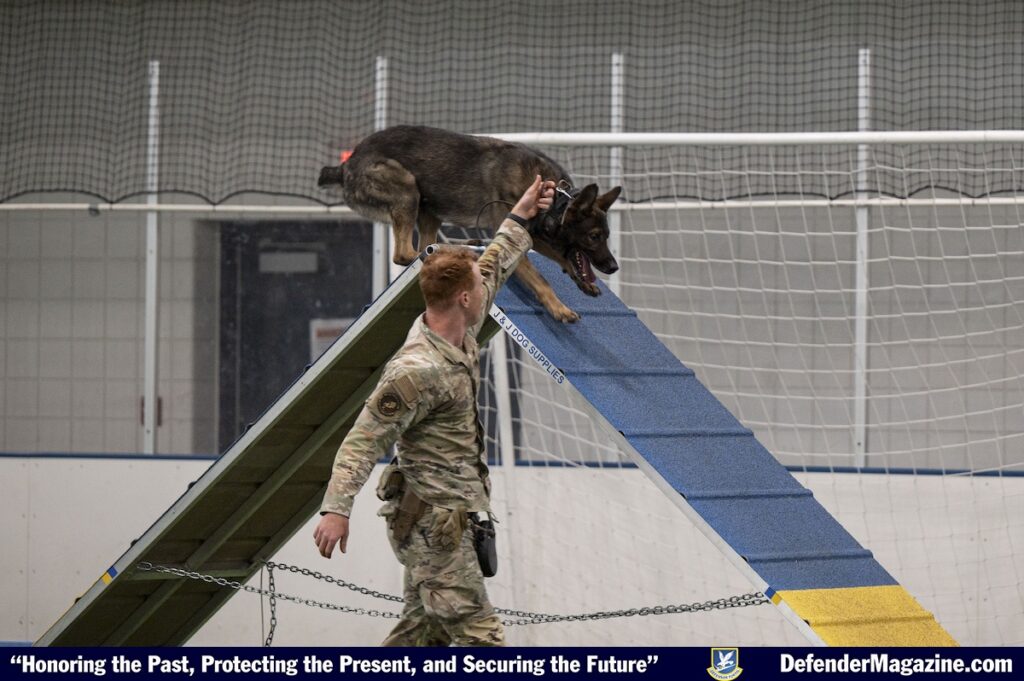 Staff Sgt. James Edwards, 319th Security Forces Squadron military working handler, leads Zorro, 319th SFS MWD, through a dog agility course during the inaugural Police Week Top Dog of the Tundra Competition at Grand Forks Air Force Base, N.D., May 13, 2025. The agility course was an unfamiliar challenge for MWDs, who are accustomed to mission-specific training that consists of obedience, detection, controlled aggression and patrol work. (U.S. Air Force photo by Airman 1st Class Emma Funderburk)