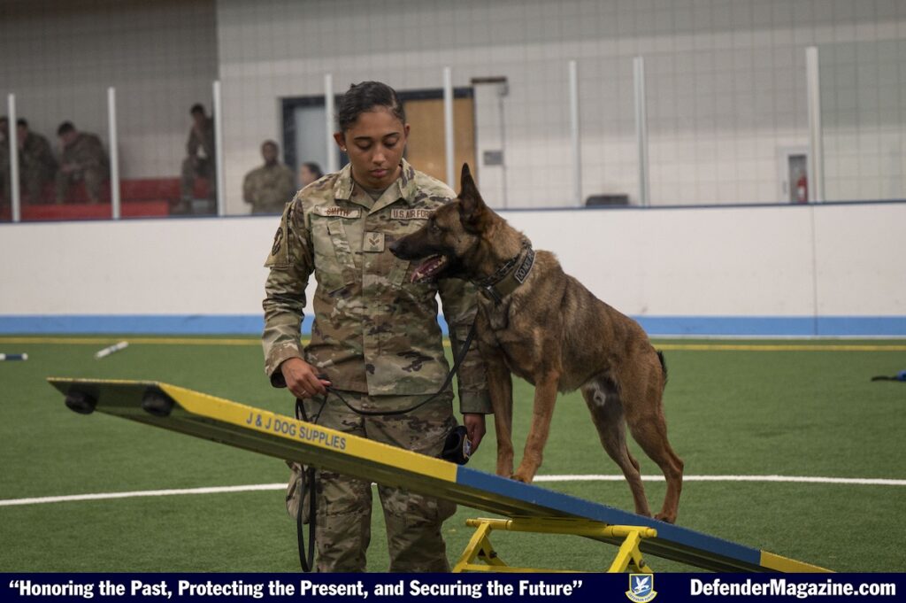 Senior Airman Alexis Smith, 319th Security Forces Squadron military working dog handler, guides Ttommaso, 319th Security Forces Squadron MWD, through a dog agility course during the inaugural Police Week Top Dog of the Tundra Competition at Grand Forks Air Force Base, N.D., May 13, 2025. The agility course was an unfamiliar challenge for MWDs, who are accustomed to mission-specific training that consists of obedience, detection, controlled aggression and patrol work. (U.S. Air Force photo by Airman 1st Class Emma Funderburk)