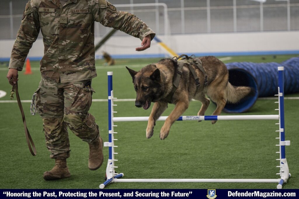 Airman 1st Class Joseph Silva, 5th Security Forces Squadron military working dog handler assigned to Minot Air Force Base N.D., runs his partner Hexo, through a dog agility course during the inaugural Police Week Top Dog of the Tundra Competition at Grand Forks Air Force Base, N.D., May 13, 2025. The final challenge of the competition was a dog agility course, to demonstrate the control and communication handlers exhibited with their MWDs. (U.S. Air Force photo by Airman 1st Class Emma Funderburk)