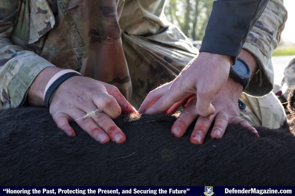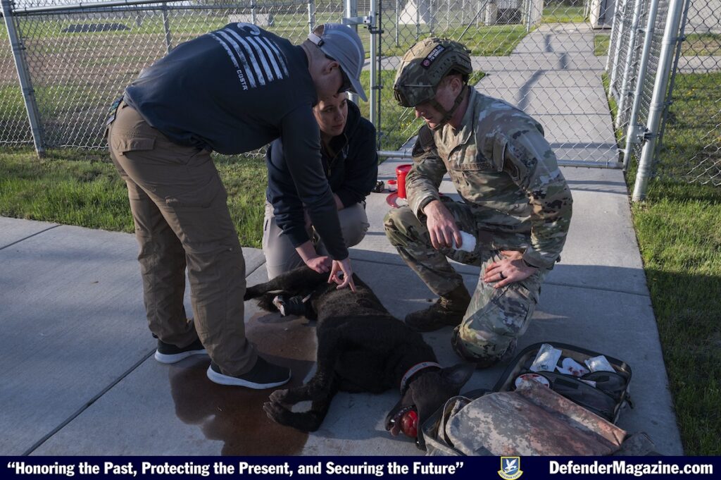 U.S. Army Capt. Joshua Middleton, veterinary corps officer of the Veterinary Readiness Activity assigned to Minot Air Force Base, N.D.; and Staff Sgt. Sally Dolance, animal care specialist of the VRA assigned to Minot AFB, review tactical combat casualty care with U.S. Air Force Staff Sgt. James Edwards, 319th Security Forces Squadron military working dog handler, at Grand Forks Air Force Base, N.D., May 13, 2025. MWD handlers have monthly training on how to perform TCCC on their dogs to ensure they are proficient and prepared to respond to a MWD medical event. (U.S. Air Force photo by Airman 1st Class Emma Funderburk)