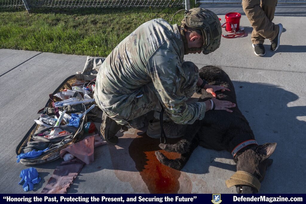 Senior Airman Caleb Manges, 319th Security Forces Squadron military working dog handler, trains in tactical combat casualty care on a Diesel Advanced Canine Medical Trainer at Grand Forks Air Force Base, N.D., May 13, 2025. The DACMT is a full-body canine simulator that is used to prepare for and practice TCCC procedures in the case of a real-life scenario. (U.S. Air Force photo by Airman 1st Class Emma Funderburk)