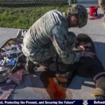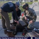 Senior Airman Caleb Manges, 319th Security Forces Squadron military working dog handler, is tested on his tactical combat casualty care knowledge during the inaugural Police Week Top Dog of the Tundra Competition at Grand Forks Air Force Base, N.D., May 13, 2025. The competition challenged airmen in scenarios where they performed TCCC on a Diesel Advanced Canine Medical Trainer, testing their capability, knowledge and proficiency. (U.S. Air Force photo by Airman 1st Class Emma Funderburk)