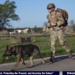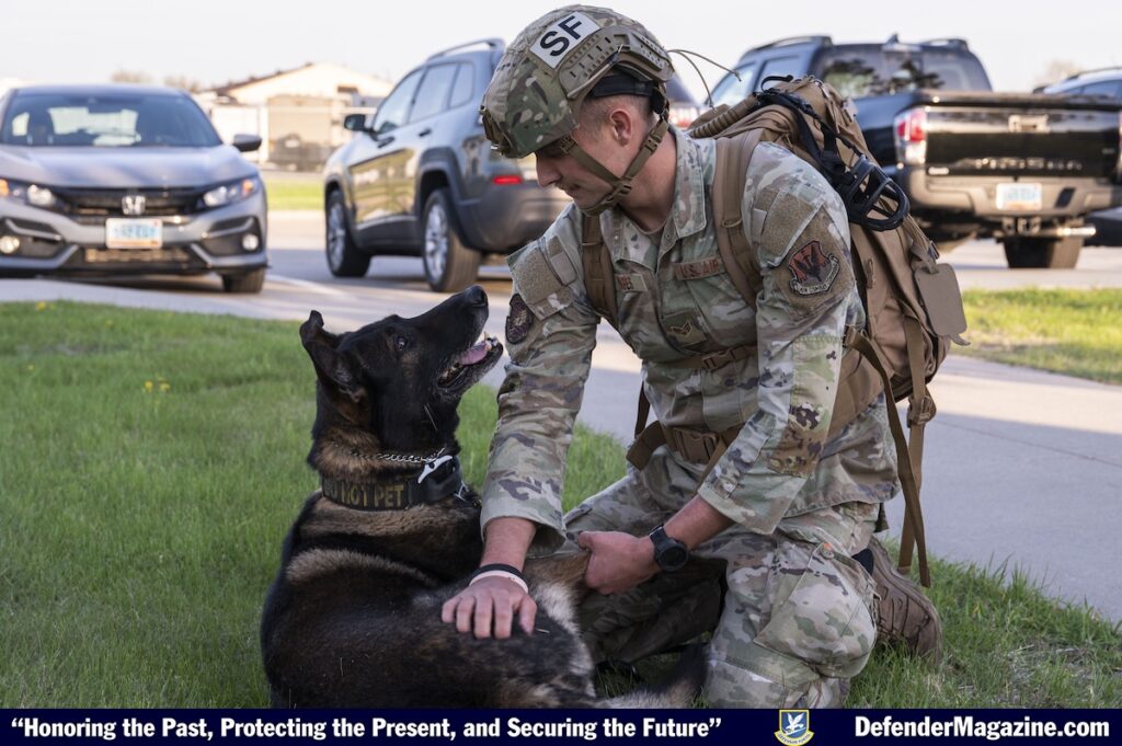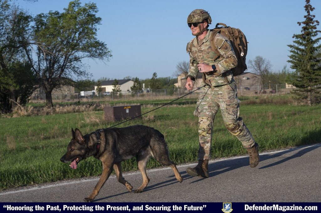 Staff Sgt. James Edwards, 319th Security Forces Squadron military working dog handler, participates in a Police Week ruck with his partner, Zorro, 319th SFS MWD, at Grand Forks Air Force Base, N.D., May 13, 2025. The 319th SFS held an inaugural Police Week competition including a two-mile ruck, where airmen wore body armor and 35-pound packs to simulate standard medical equipment and gear required to conduct security operations with their K-9. (U.S. Air Force photo by Airman 1st Class Emma Funderburk)