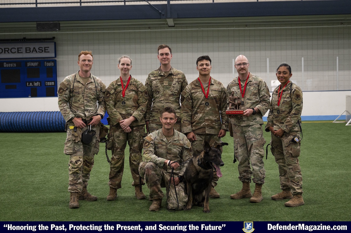A group of airmen assigned to the 319th Security Forces Squadron and the 5th Security Forces Squadron pose for a photo at Grand Forks Air Force Base, N.D., May 13, 2025. There were five awards given for each of the individual events at the inaugural Police Week Top Dog of the Tundra Competition: Fastest ruck and top proficiency in tactical combat casualty care, substance detection, obedience and controlled aggression and the overall award of Top Dog of the Tundra (U.S. Air Force photo by Airman 1st Class Emma Funderburk)