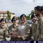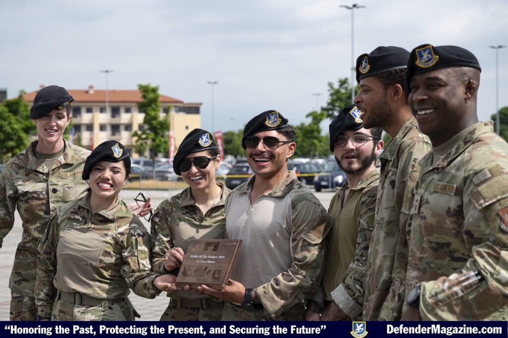 Members of the 31st Security Forces Squadron pose with a plaque after winning first place in the Battle of the Badges competition during Police Week at Aviano Air Base, Italy, May 15, 2025. Battle of the Badges is an annual event celebrating friendly competition between various badge-wearing agencies across the installation. (U.S. Air Force photo by Staff Sgt. Brooke Rogers)