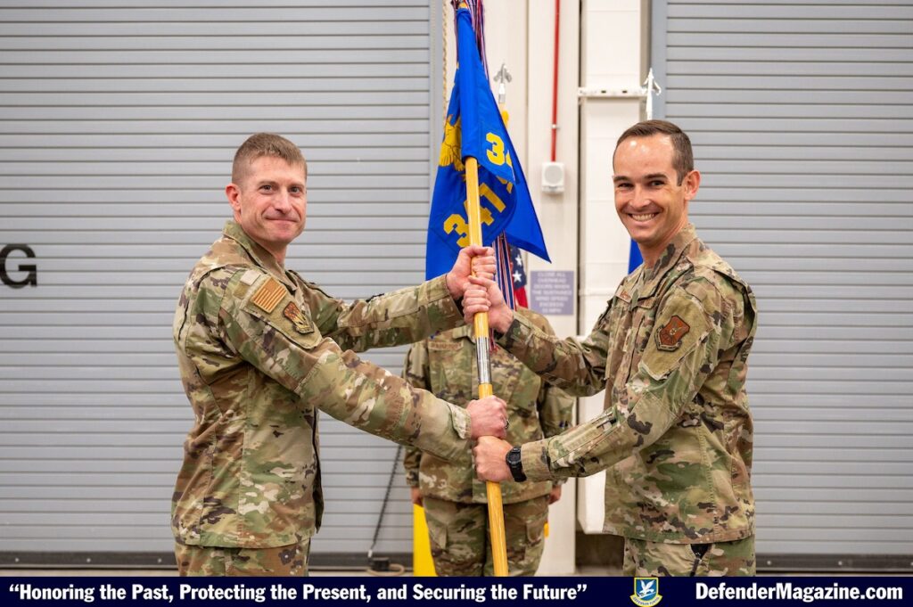 MALMSTROM AIR FORCE BASE, Mont. — Maj. Daniel Merkh, right, accepts command of the 341st Security Forces Squadron from Col. James Meier, 341st Security Forces Group commander, left, during a change of command ceremony at Malmstrom AFB, Mont., June 9, 2025. The 341 SFS provides law enforcement services to the main base complex, ensuring Team Malmstrom remains a safe and law-abiding community for a base population of more than 10,000. (U.S. Air Force photo by Airman 1st Class Jack Rodriguez Escamilla)