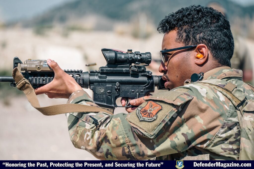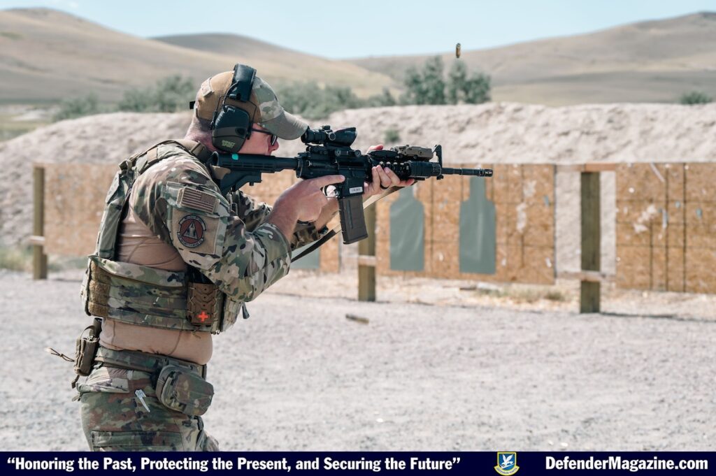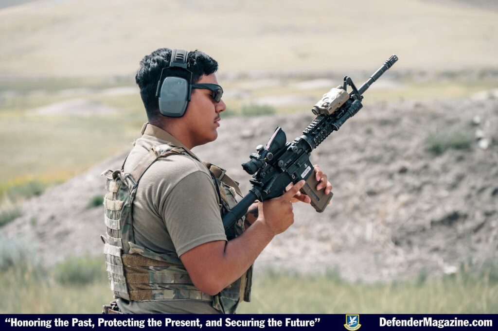 An Airman assigned to the 341st Security Forces Squadron shoots at a target Aug. 15, 2025, at Fort William Henry Harrison, Mont. Training days spent at the firing range assist Malmstrom’s Defenders in building weapons handling muscle memory, leading to quicker reactions in real-world situations. (U.S. Air Force photo by Airman 1st Class Jack Rodriguez Escamilla)