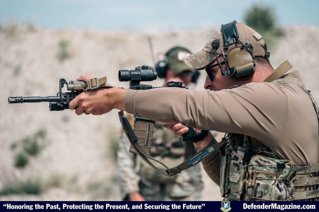 An Airman assigned to the 341st Security Forces Squadron shoots at a target Aug. 15, 2025, at Fort William Henry Harrison, Mont. The 341st Security Forces Group regularly partners with the Montana National Guard to provide firing range availability for their Airmen to practice weapons handling. (U.S. Air Force photo by Airman 1st Class Jack Rodriguez Escamilla)