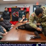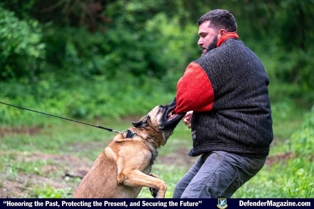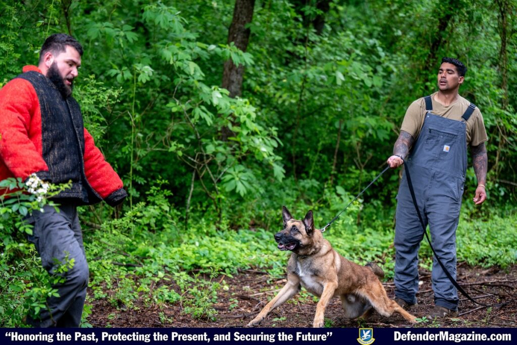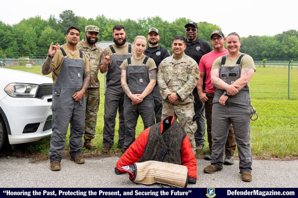 DOVER AIR FORCE BASE, Delaware — Members of the 436th Security Forces Squadron military working dog team and Worcester County Sheriff’s Office Maryland, pose for a photo at Dover Air Force Base, Delaware, May 14, 2025. The 436th SFS hosted the WCSO for a day of knowledge sharing focused on K-9 Tactical Combat Casualty Care and dog tracking training. (U.S. Air Force photo by Senior Airman Trenten Walters)
