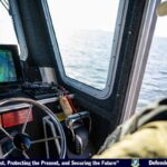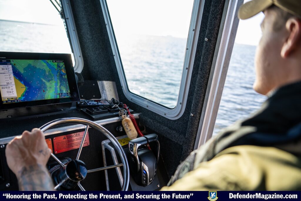 U.S. Air Force Senior Airman Justin Davis, 6th Security Forces marine patrolman, follows a global positioning system at MacDill Air Force Base, Florida, June 26, 2025. Marine patrol sees higher activity in the summer when vessels are more likely to travel along MacDill’s coastline. (U.S. Air Force photo by Staff Sgt. Christopher Tam)