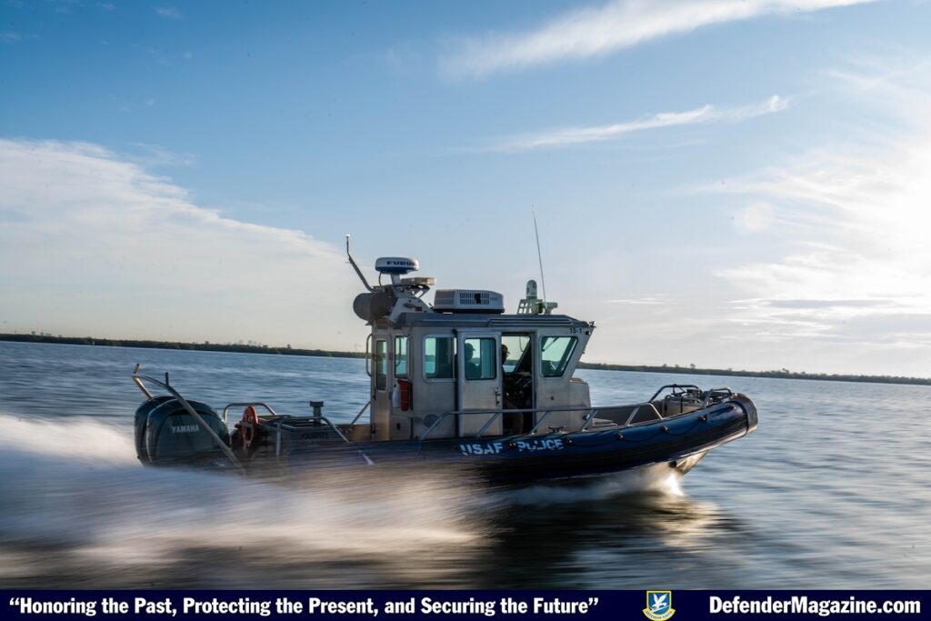 A U.S. Air Force vessel assigned to the 6th Security Forces Marine Patrol unit, monitors the coastline at MacDill Air Force Base, Florida, June 26, 2025. The 6th SFS Marine Patrol unit provides security for 7.2 miles of coastline around MacDill AFB. (U.S. Air Force photo by Staff Sgt. Christopher Tam)