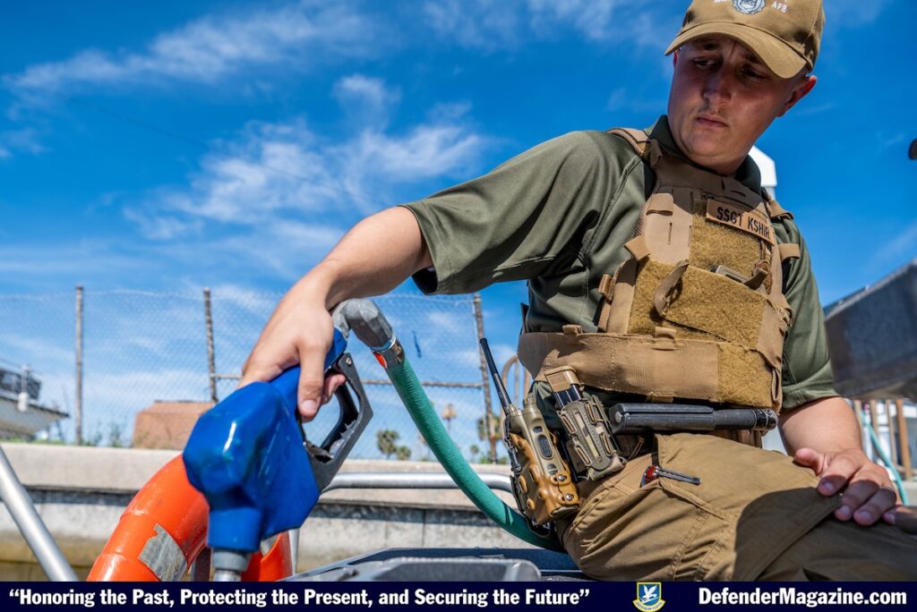 U.S. Air Force Staff Sgt. Jason Kshir, 6th Security Forces marine patrolman, pumps gas into a vessel at MacDill Air Force Base, Florida, June 26, 2025. In addition to securing MacDill’s 7.2-mile coastline, marine patrol conducts detection and surveillance of any suspicious vessels and ensures neutralization of any possible threats. (U.S. Air Force photo by Staff Sgt. Christopher Tam)