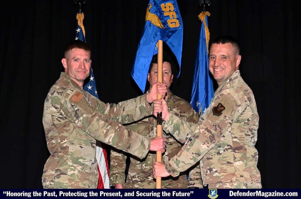 MALMSTROM AIR FORCE BASE, Mont. — Maj. Karl Fagnant, right, accepts command of the 841st Missile Security Forces Squadron from Col. James Meier, 341st Security Forces Group commander, left, during a change of command ceremony at Malmstrom AFB, Mont., May 15, 2025. The 841st MSFS is one of three missile security forces squadrons at Malmstrom and is responsible for providing security for the largest intercontinental ballistic missile complex in the world. (U.S. Air Force photo by Staff Sgt. Trevor Rhynes)