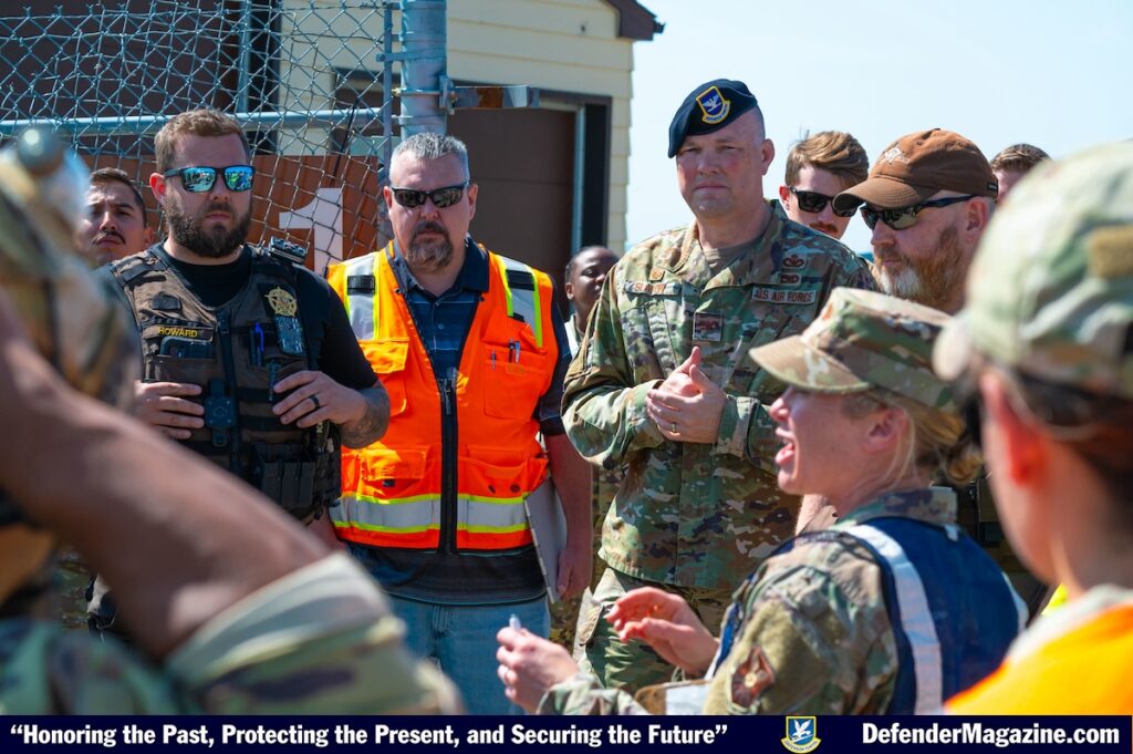 Team Minot mass casualty exercise leads discuss lessons learned during the exercise at missile alert facility outside of Minot Air Force Base, North Dakota, June 17, 2025. This partnership allows local law enforcement to gain firsthand experience with military procedures during active shooter scenarios.
