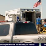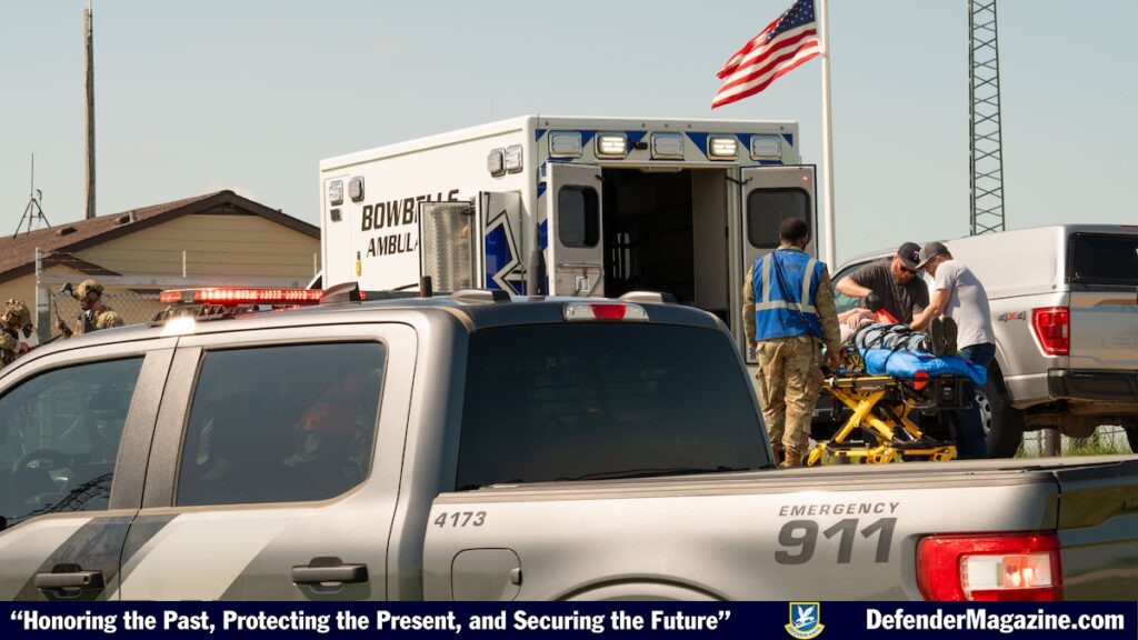 First responders load an injured man lying on a gurney during a mass casualty exercise outside of Minot Air Force Base, North Dakota, June 17, 2025. The exercise was in conjunction with the 91st Security Forces Group and 54th Helicopter Squadron as well as local first responders in an attempt to strengthen communication and response time.