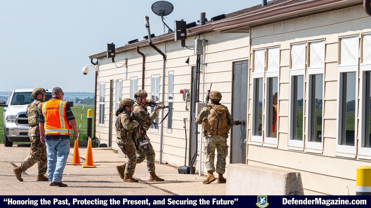 MINOT AIR FORCE BASE, N.D. — Airmen from the 91st Security Forces Group prepare to enter a building during a mass casualty exercise at a missile alert facility outside of Minot Air Force Base, North Dakota, June 17, 2025. This partnership allows local law enforcement to gain firsthand experience with military procedures during active shooter scenarios.