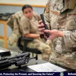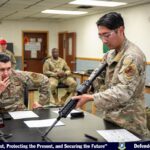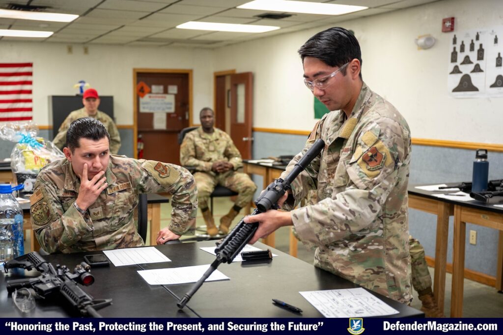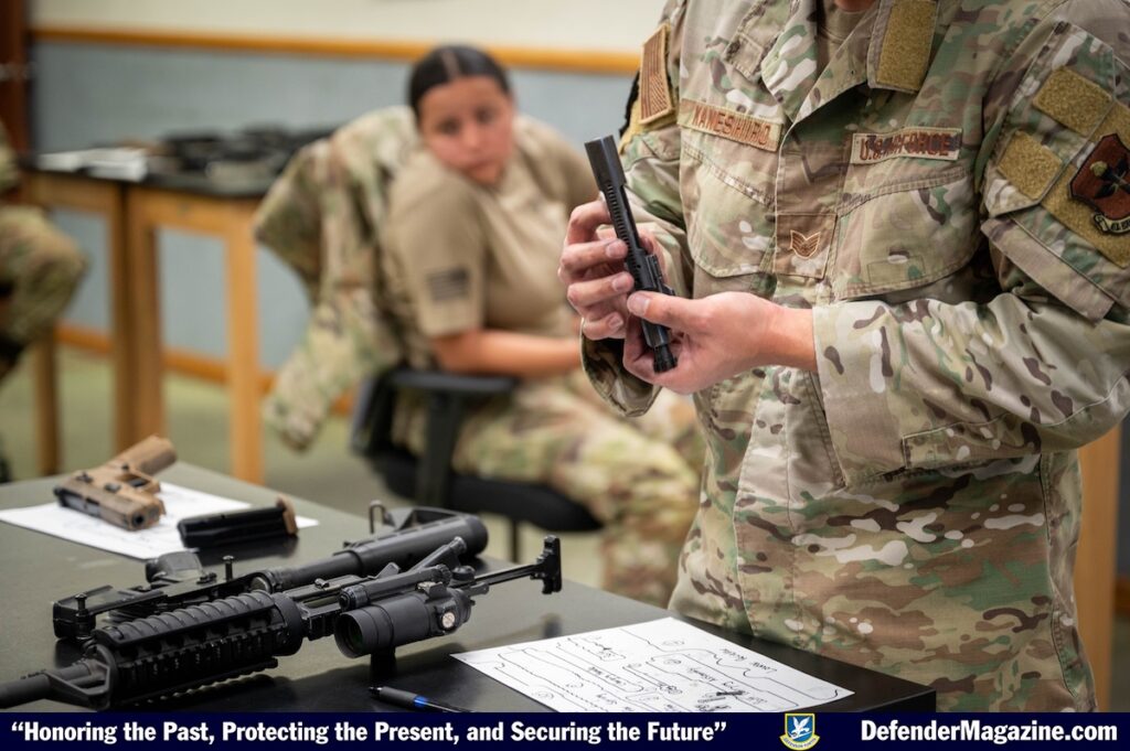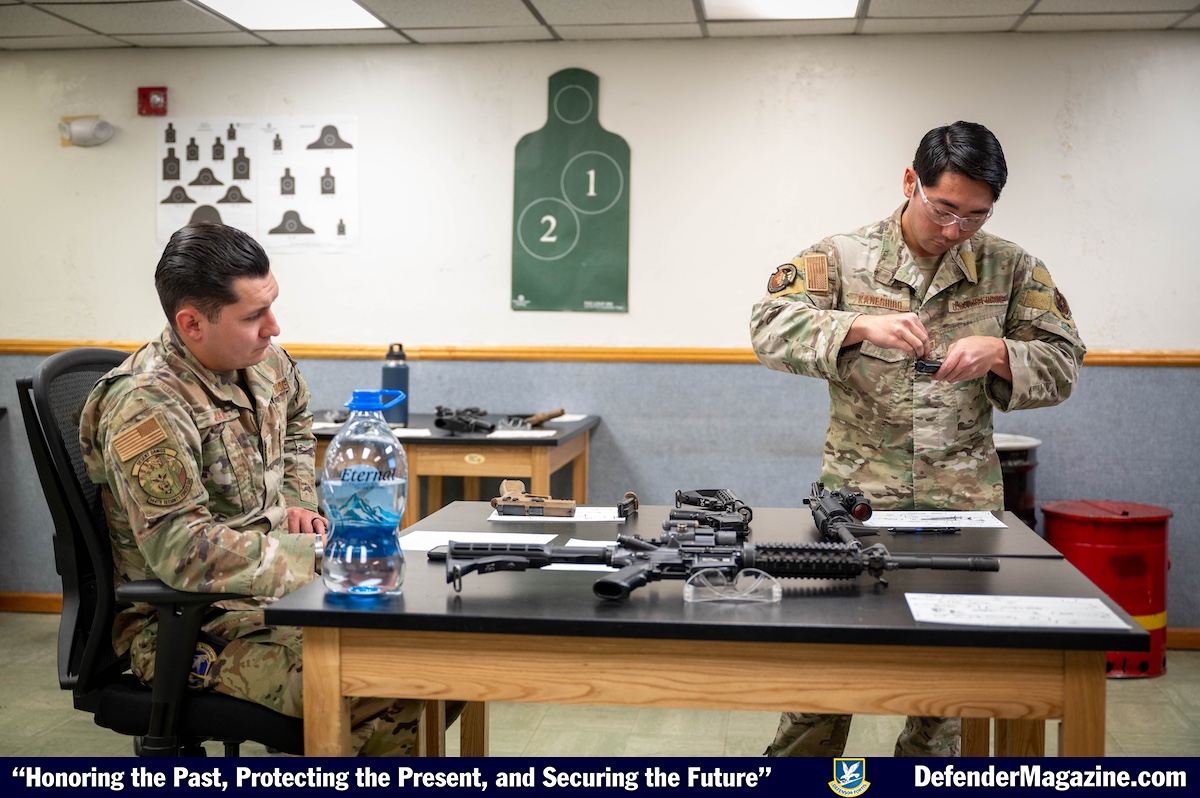 LUKE AIR FORCE BASE, Ariz. — U.S. Air Force Staff Sgt. Alexander Juarez, 944th Security Forces Squadron defender, watches as Staff Sgt. Casey Kaneshiro, 309th Aircraft Maintenance Unit weapons load crew member, disassembles an M4 carbine during a manipulation competition for National Police Week, May 14, 2025, at Luke Air Force Base, Arizona. Participants conducted timed disassembly, reassembly, and function drills of the M4 carbine and M17 pistol for a chance to win prizes. National Police Week honors the men and women of law enforcement agencies around the country, while remembering those who gave their lives in service. (U.S. Air Force photo by Senior Airman Jakob Hambright)