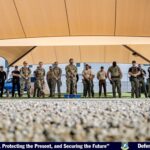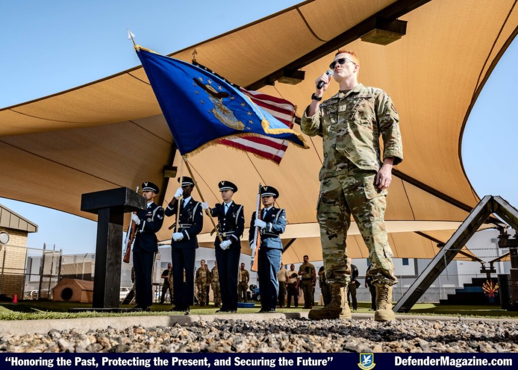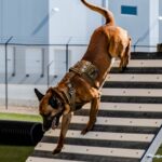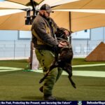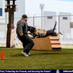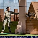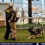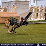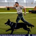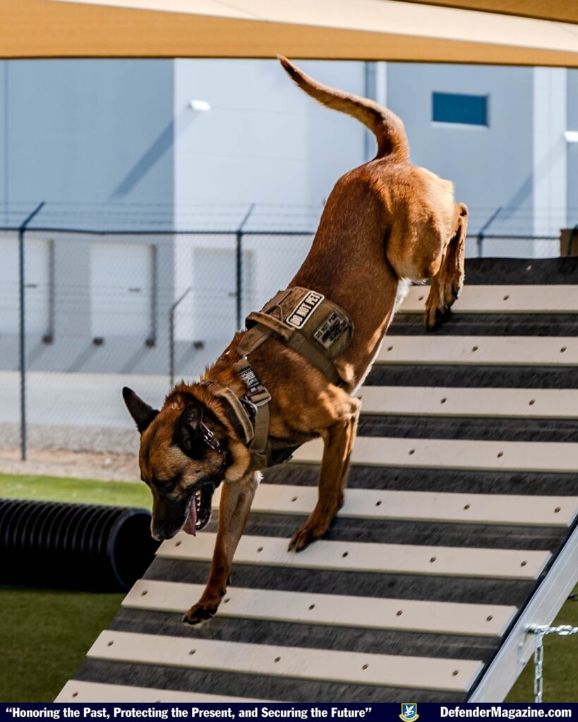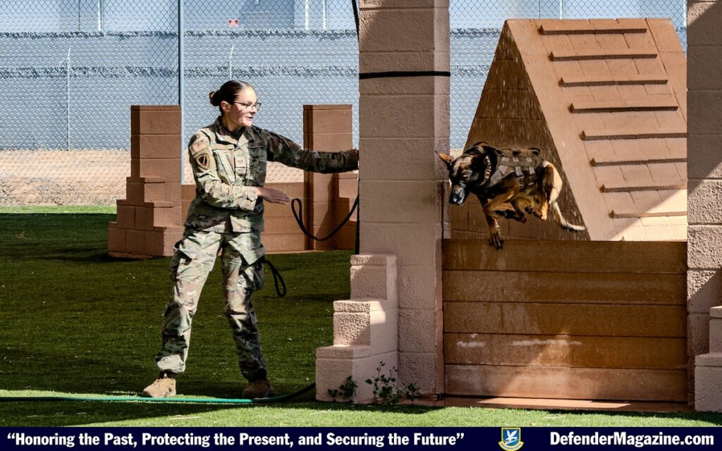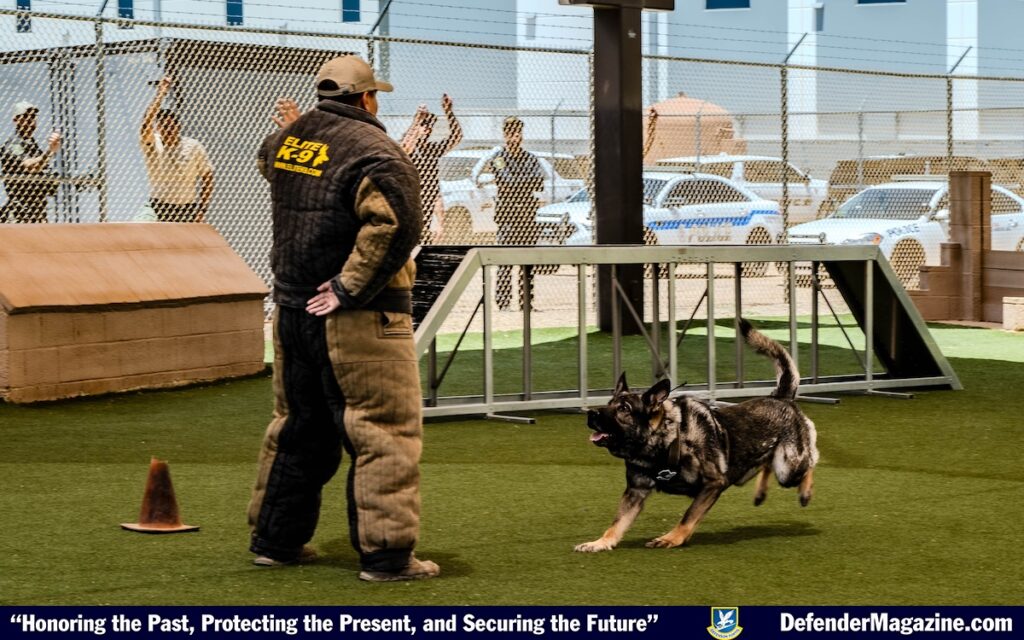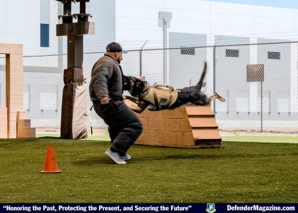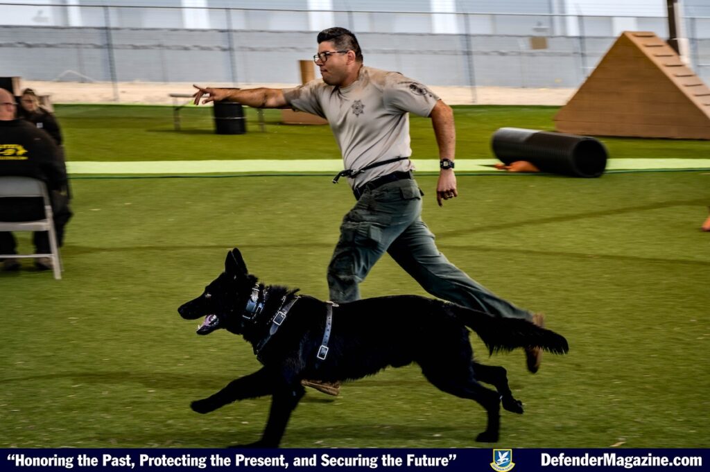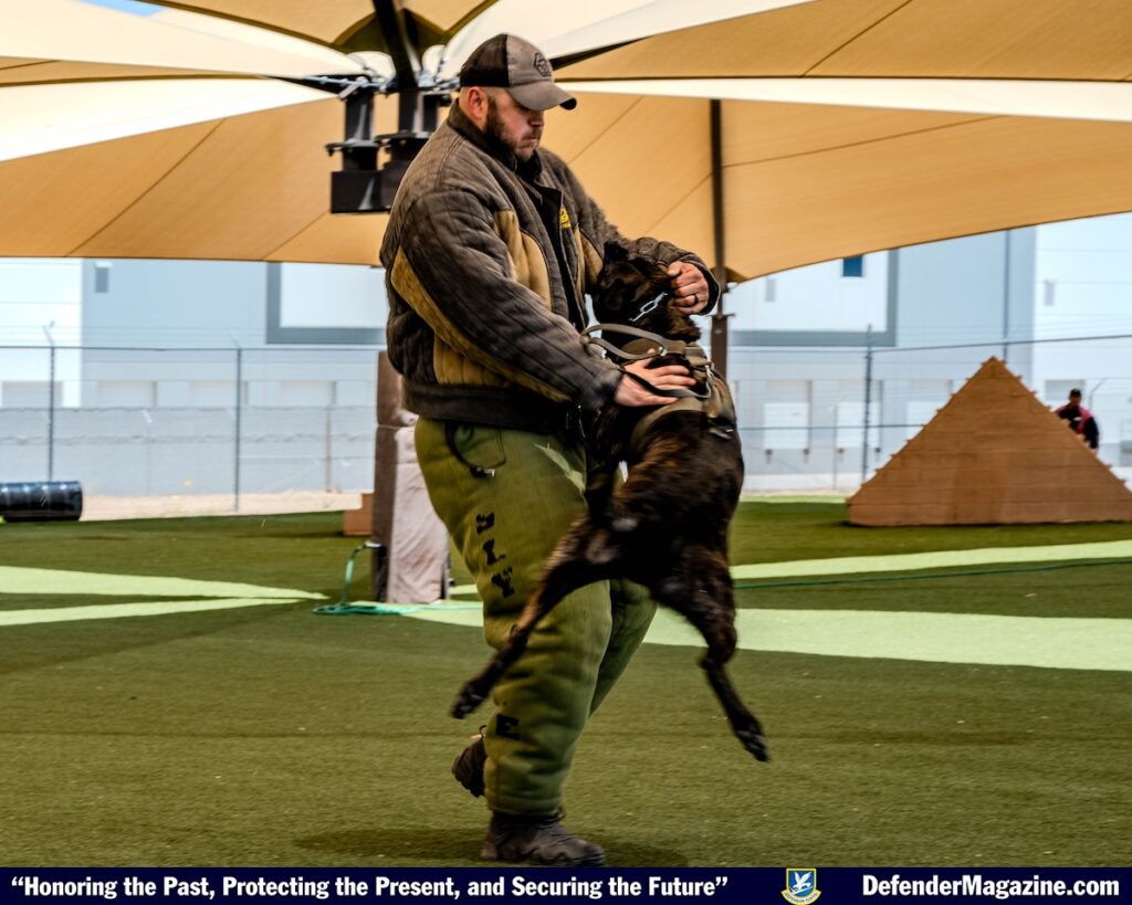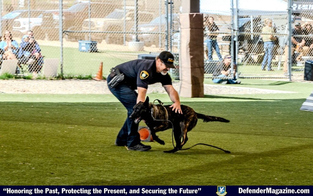 LUKE AIR FORCE BASE, Arizona — Officer Chris Wheeler, Casa Grande Police dog handler, grabs his canine, Rik, during a police and military K-9 competition, May 14, 2025, at Luke Air Force Base, Arizona. During the K-9 competition, police and military working dogs were evaluated on their speed and ability to follow commands. This event highlighted the precise control and discipline required of these working dogs in resisting distractions. (U.S. Air Force photo by Airman 1st Class Belinda Guachun-Chichay)