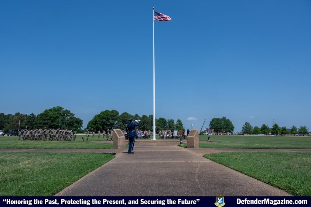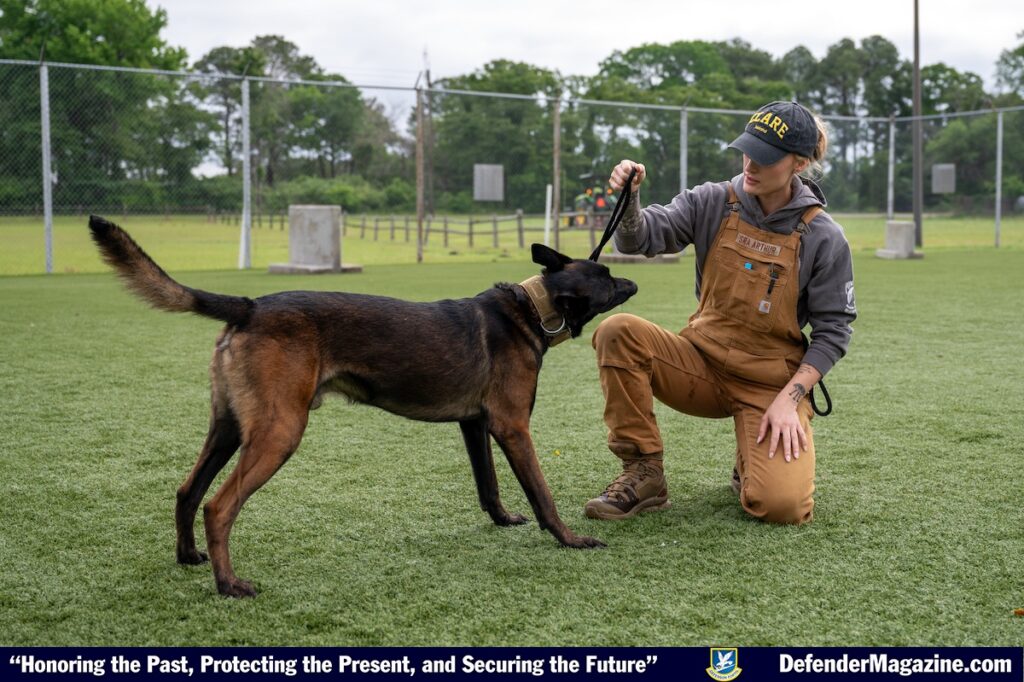 JOINT BASE LANGLEY-EUSTIS, Va. – U.S. Air Force Senior Airman Emily Arthur, 633d Security Forces Squadron military working dog handler, and Tommy, her K-9 partner, practice obedience training at Joint Base Langley-Eustis, Virginia, May 14, 2025. The training prepared Tommy for daily tasks, such as responding to commands, maintaining focus in crowded areas, and performing patrols. (U.S. Air Force photo by Airman 1st Class Skylar Ellis)